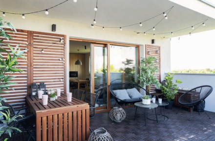 Taras i balkon są dla nas atrakcyjne także wieczorem. Lubimy na nich spędzać czas po zmroku, gdy tylko pogoda na to pozwala. Nie byłoby to możliwe, gdyby nie różnego rodzaju oświetlenie sztuczne.