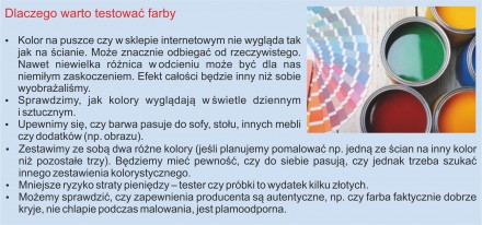 Ten sam kolor może wyglądać inaczej w różnych pomieszczeniach. Dlatego zamiast kupować duże wiadro farby, warto najpierw wypróbować niewielkie testery. Pomalowanie fragmentów ściany dwoma warstwami farb w wybranych odcieniach pozwoli wybrać ten, który spełni nasze oczekiwania. Zamiast ściany możemy pomalować biały karton. Najlepiej umieścić go zarówno przy oknie, jak i tam, gdzie dociera najmniej światła słonecznego, a także w narożniku i przy posadzce, w świetle dziennym i przy sztucznym oświetleniu. Pozwoli to sprawdzić, jak dany odcień się prezentuje. Testery dostępne są najczęściej w 50 ml pojemnikach – to wystarcza na pomalowanie ok. 1 m2 powierzchni.