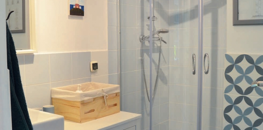 Gospodarze remontują i wprowadzają zmiany w aranżacji domu od kilku lat, chcąc całkowicie odmienić jego zastany charakter – aranżowane przez poprzednich właścicieli wnętrza były ciemne – w okładzinach i meblach dominowały ciemne brązy oraz granaty. Sukcesywnie wprowadzane zmiany miały więc przede wszystkim rozjaśnić przestrzeń, a  nową kolorystyką nawiązać do nadmorskiego otoczenia. Celem kolejnych liftingów i  remontów jest również zachowanie spójnej estetyki wykończenia wszystkich wnętrz. Budowa WC na poddaszu i wywołany tym przedsięwzięciem remont łazienki na parterze były więc pretekstem do kolejnej odmiany. Nie bez żalu gospodarze podjęli więc decyzję o skuciu granatowej glazury w łazience na parterze. Zastąpiły ją płytki, w których dominują jasne rozbielone błękity i  szarości, zgaszone odcienie turkusu, a całość uzupełniają niewielkie akcenty kolorystyczne. Ściany WC wykończono białymi płytkami, których forma przypomina stare kafle piecowe, ale uwagę przykuwa bardzo dekoracyjna patchworkowa posadzka. Jest wielokolorowa, ale niebieska szafka umywalkowa „podkręca” jej błękitne elementy – w ten sposób łazienka pozostaje w  zgodzie z marynistycznym stylem domu. Projekty łazienek gospodarze wykonali sami – nie było to trudne, bo założeniem miała być stonowana kolorystyka ścian oraz wzorzyste podłogi. Szczegóły kompozycji weryfikowano na bieżąco, „przymierzając” je najpierw na podłodze.