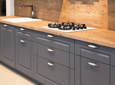 Strefa robocza w kuchni należy do miejsc najbardziej narażonych na zabrudzenia i zniszczenie. Wygodne w utrzymaniu czystości będą blaty odporne na wilgoć czy zarysowania. Takie właściwości mają twarde blaty kamienne, np. granitowe o nasiąkliwości poniżej 0,5%. Blaty marmurowe są bardziej nasiąkliwe i łatwo się plamią, np. sokami owocowymi. Warto je zaimpregnować podobnie jak trawertynowe. Do trwałych należą kompozytowe. Wpływ na ich wysoką odporność na uszkodzenia mechaniczne i wilgoć ma pozyskiwany ze zmielonej skały wodorotlenek glinu. Na tego typu zagrożenia odporne są też konglomeraty, zwłaszcza granitowe. Jeśli zdecydujemy się na blaty laminowane, wybierzmy pokryte najwyższej jakości żywicami melaminowymi. Będą odporne na wilgoć, zarysowania i odpryski. Wykorzystując blaty drewniane, sięgajmy po wykonane z twardych gatunków drewna, np. dębiny, teku lub iroko. Ze względu na wilgoć zaleca się stosować na blaty drewno klejone. Proces klejenia likwiduje naturalne naprężenia włókien, co zapobiega wypaczaniu i pękaniu drewna. Jeśli stosujemy stalowe lub szklane, do krojenia na nich koniecznie wykorzystujmy deski. Na ich powierzchni widać każdą kroplę wody, co utrudnia ich utrzymanie w czystości.