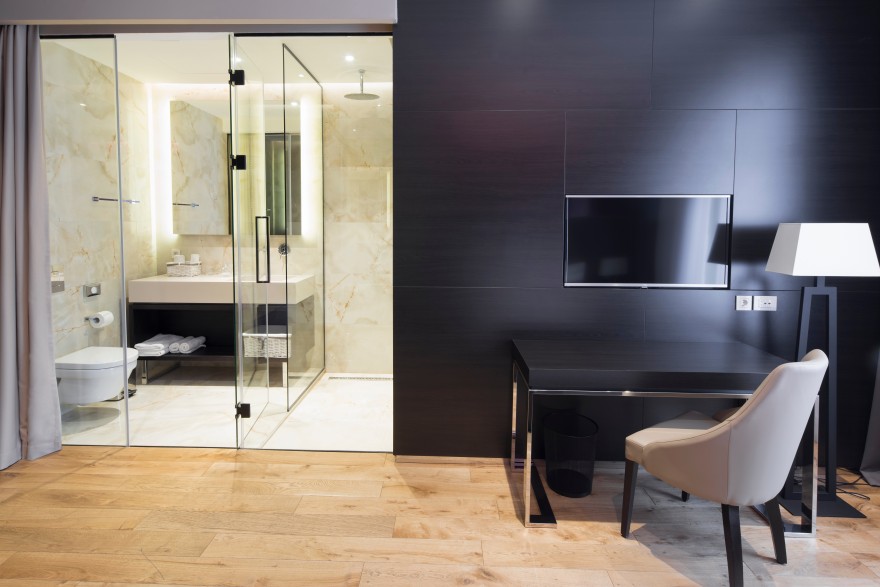 Połączenie sypialni z sąsiadującą łazienką poprzez przeszklone drzwi lub całkowitą z nich rezygnację jeszcze bardziej zespala funkcje obu pomieszczeń. Przezroczysta szklana ścianka zastępująca pełną przegrodę na pewno jest efektownym elementem master bedroom. Powiększa optycznie oba wnętrza, a wieczorem można każde z tych pomieszczeń doświetlić, korzystając ze światła w sąsiedztwie. Gdy w łazience nie ma okna, światło dzienne wpadające przez okno sypialni dotrze również do łazienki. Włączenie wizualne oryginalnie urządzonej łazienki może ponadto uatrakcyjniać sypialnię i odwrotnie – widok z łazienki na piękną sypialnię może być dodatkowym źródłem relaksu. Dla niektórych jednak takie rozwiązanie może zaburzać poczucie prywatności. Gdy zupełnie zrezygnujemy z drzwi między sypialnią a łazienką, będziemy mieli ją w zasięgu ręki – nocą, w drodze do toalety, nie musimy pokonywać barier w postaci drzwi, a biorąc kąpiel w wannie możemy rozmawiać ze współmałżonkiem przebywającym w sypialni. Rozwiązanie to może jednak rodzić pewne problemy. Łazienka jest miejscem zaliczanym do mokrych – korzystamy tu z wody, a podczas ciepłych kąpieli gromadzi się sporo pary wodnej, która podnosi poziom wilgotności powietrza. W sypialni z łazienką tak bezpośrednio połączoną  również zwiększa się ryzyko zwiększenie poziomu wilgoci, dzieje się tak w szczególności wtedy gdy oba pomieszczenia nie są odpowiednio wentylowane. Połączenia łazienki z sypialnią są zazwyczaj bezprogowe, co z kolei rodzi niebezpieczeństwo zamakania podłogi w sypialni — może to nastąpić wtedy, gdy woda spod prysznica przedostaje się do pokoju. Gdy w sypialni będzie podłoga drewniana może szybko ulec zniszczeniu.