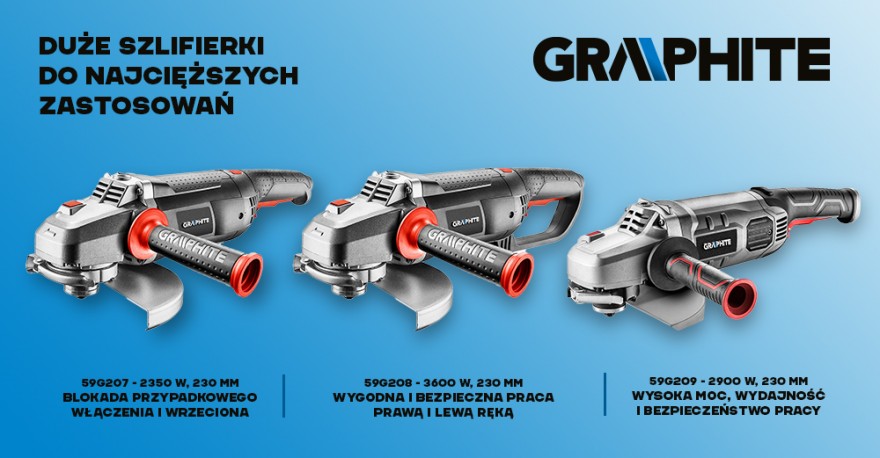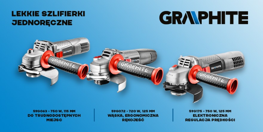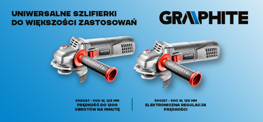 Pierwszym modelem jest szlifierka Graphite 59G120. Ten produkt ma wygodny włącznik w rękojeści wyposażony w blokadę automatycznego uruchomienia oraz daje możliwość ustawienia uchwytu bocznego w trzech kątach. Model 59G220 to podobna szlifierka kątowa 125 z regulacją obrotów. Możliwość ustawiania prędkości obrotowej pomiędzy 3000 a 10000 obrotów na minutę wpływa na precyzję wykonywanych prac i bardziej uniwersalne zastosowanie narzędzia.