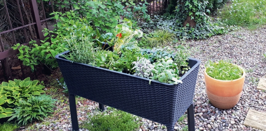 Do amatorskiej uprawy warzyw i ziół poleca się gotowe mieszanki ziemi o  zbilansowanym składzie (np. ziemia do warzyw, ziemia do pomidorów czy podłoże do ziół). Dodatkowo na rzecz szybkiego i ładnego rozrostu oraz owocowania można wzbogacić ziemię niewielką ilością nawozu w granulacie – najlepiej obornika kurzego lub bydlęcego. Uprawa ziół i warzyw na tego typu podwyższonej grządce jest zwykle sezonowa. Dlatego warto nie czekać zbyt długo na plon, a korzystać już na wiosnę z  własnych upraw. Wygodnie zatem będzie, tak jak zrobiła to pani Agnieszka, posadzić w  warzywniku gotowe, ukorzenione i pięknie rozkrzewione sadzonki. Do upraw amatorskich znajdziemy wiele smacznych, a  przy tym dekoracyjnych odmian roślin uprawnych. Pani Agnieszka do swojej plantacji wybrała: pomidorki koktajlowe, buraki liściaste, poziomki oraz takie zioła jak: szałwia lekarska w odmianie tradycyjnej i trikolor, mięta pieprzowa, bazylia i bazylia tajska, majeranek, oregano, rozmaryn, pietruszka naciowa. Jako element dekoracji oraz cenny w  kuchni kwiat do ozdabiania potraw posadziła również nasturcje.